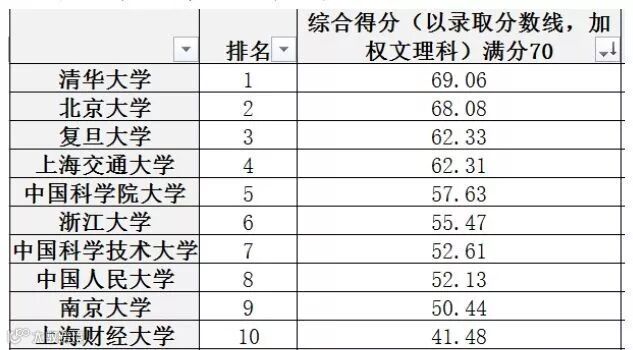按照上文叙述的录取分数线评分体系,我们得到文科如下排名结果(录取分数线得分满分70分),具体体现出来的一些有趣的点,我们将在第六章详细讨论