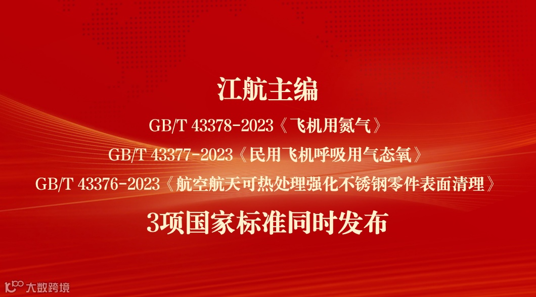 近日,从国家标准委获悉,由航空工业江航主编的GB/T 43378-2023《飞机用氮气》、GB/T 43377-2023《民用飞机呼吸用气态氧》、GB/T 43376-2023《航空航天可热处理强化不锈钢零件表面清理》等3项国家标准同时发布。