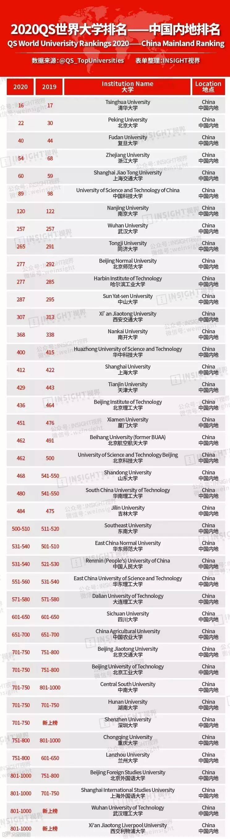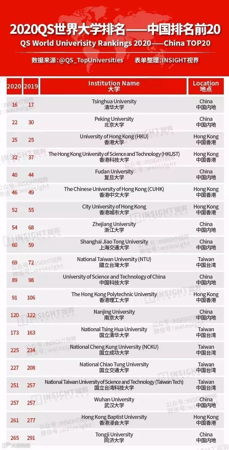 综合中国所有上榜学校之后,前20位的中国大学有: