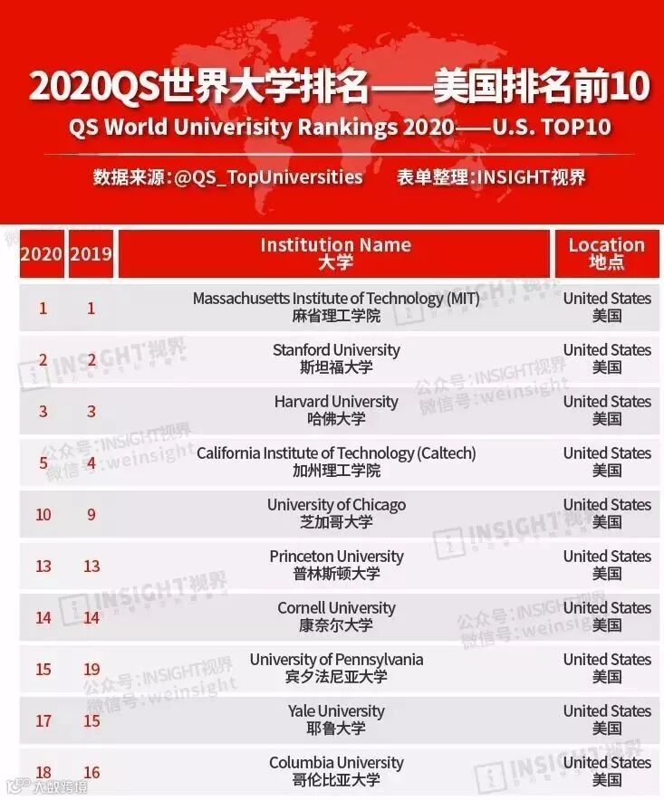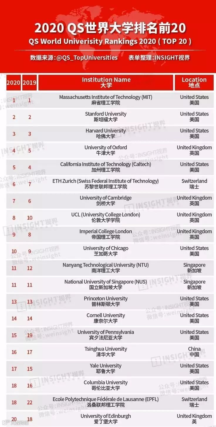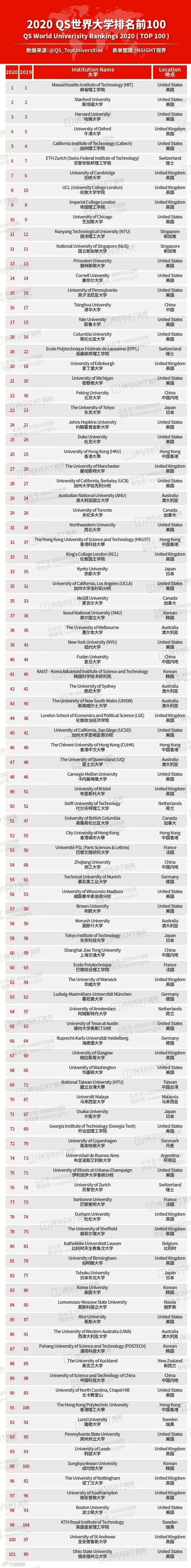 以下是本次QS世界大学排名的Top100榜单。