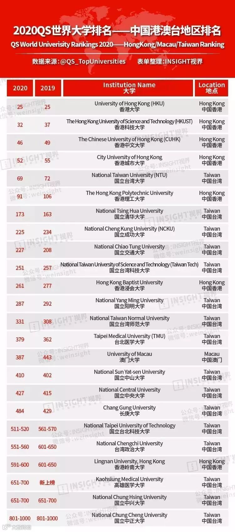 港澳台地区实力同样不容小觑,我们熟知的香港6所名校中,除了香港浸会大学,其他5所都位列世界大学前100,领跑港澳台。而且香港浸会大学相较于去年,排名也有明显提升,从277名到261名。澳门仅有澳门大学一所学校上榜。香港澳门学校数量太少,所以上榜名额有限,但台湾学校数量很多,上榜学校也多,但排名并不理想。