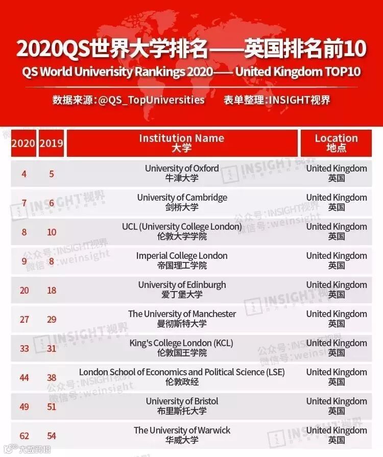 同期亚洲不能错过的是亚洲最佳的新加坡,今年南洋理工大学和国立新加坡大学两所学校排名并列11,果然相亲相爱!欧洲同样作为老牌教育之国的英国在整体排名上也有下滑趋势,84所参与排名的英国大学中50所都有下降,只有12所上升,剑桥大学更是出现了五年来的第一次下跌,由去年的第六名变为今年的第七名,第六名被来自瑞士的苏黎世联邦理工学院夺得。当然英国在顶尖学校层面并不甘落后,前10名中依然有4所学校入围,分别是第四名的牛津,第七名的剑桥,第八名的伦敦大学学院,以及第九名的帝国理工学院。前10名的学校数量仅次于美国。