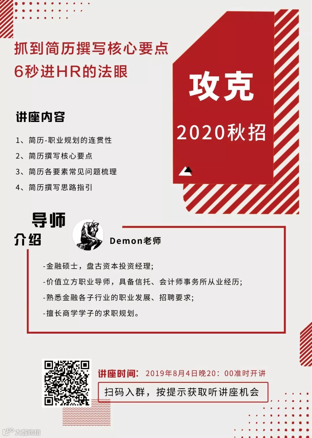 金融小伙伴【攻克2020秋招】免费系列讲座【第二期:抓到简历撰写的核心要点,6秒进HR的法眼】,8月4日(本周日)晚20:00准时开讲!
