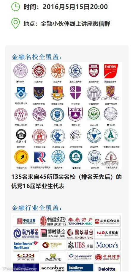 2019年金融小伙伴第五届高校毕业生金融求职分享会邀请全球各大名校 ,百位金融精英为本次主讲嘉宾,于2019年6月15日晚20:00-22:00在金融小伙伴线上讲座微信群开讲!