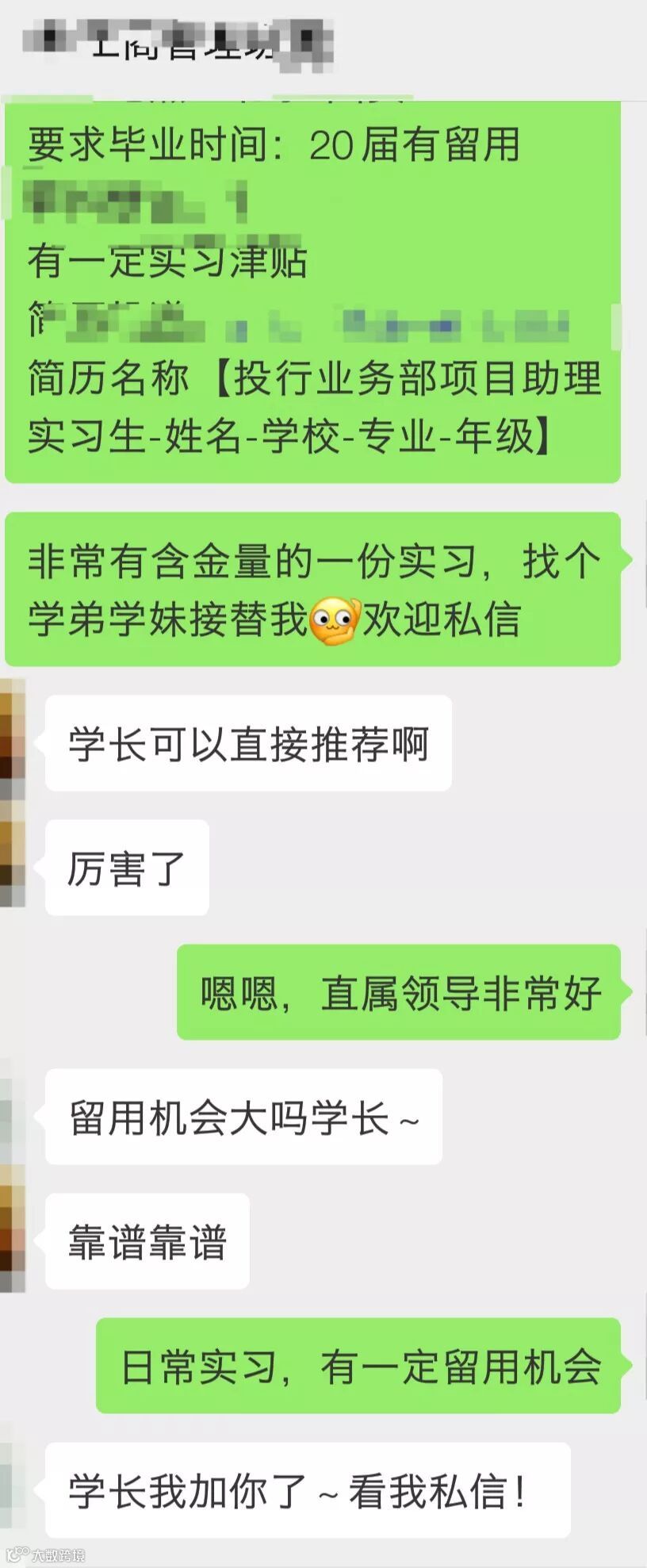 校友实习群的宗旨是:帮助学长学姐找到更靠谱的“接班人”,帮助学弟学妹找到更靠谱的内推机会!(本类群只作校友实习资源交流的平台使用,拒绝任何付费内推)
