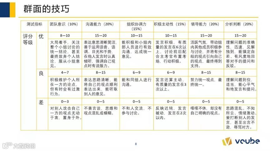 阅题和思考的几分钟如白驹过隙,很快就会进入个人观点阐述时间。在这个阶段千万别闲着,记录下每个人发言的要点,体会他们表达观点的方式,对他们是什么类型的人做一个大概的分类,这会为你的集体讨论环节大大加分!