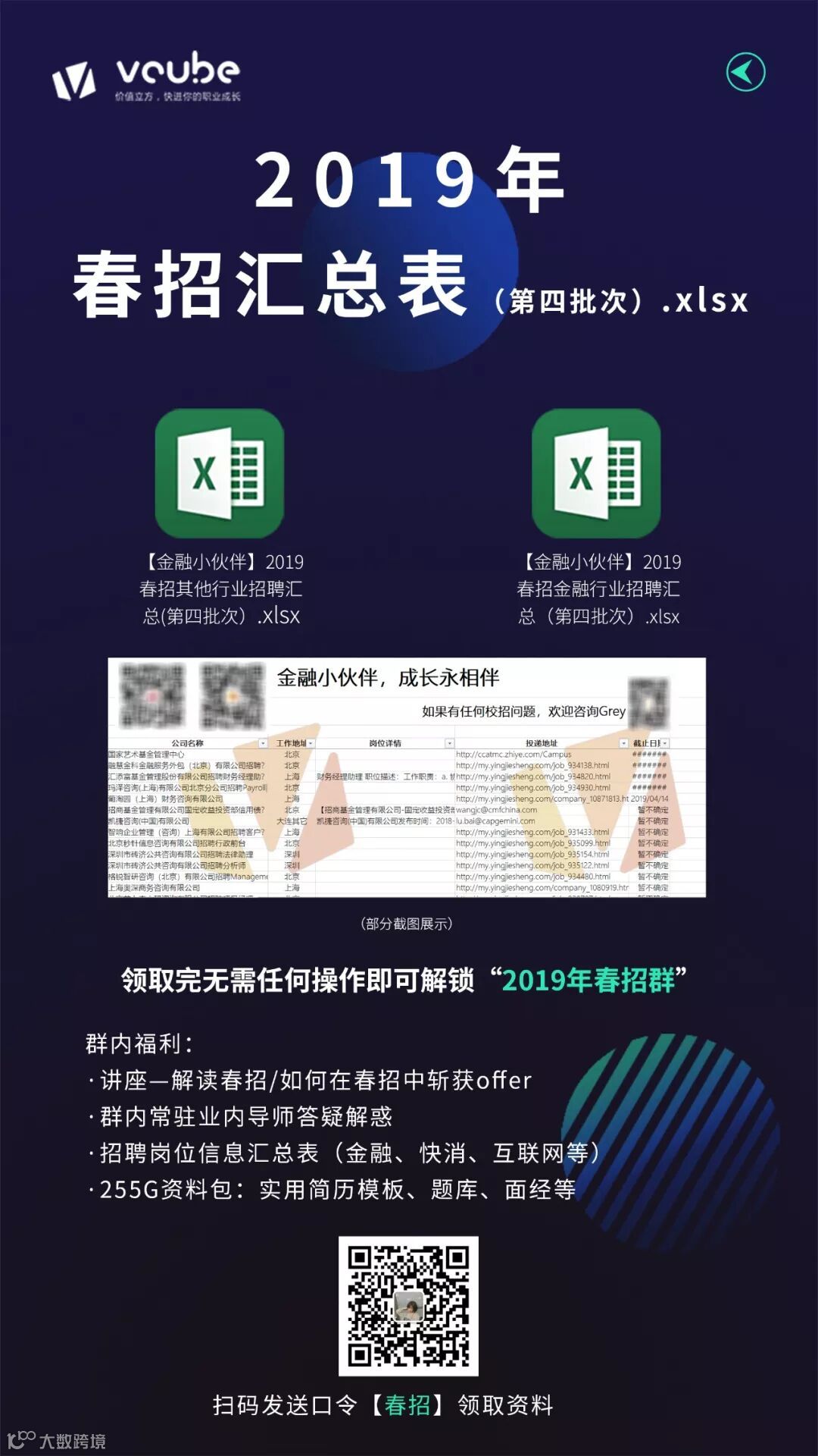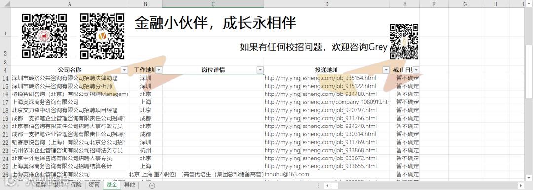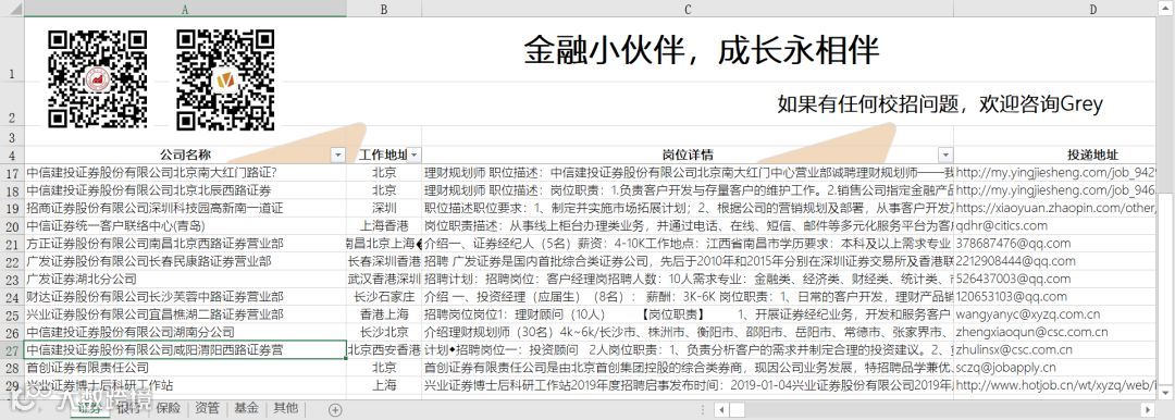 汇总表分为两份,金融机构春招汇总表.xlsx和其它行业春招汇总.xlsx。其中金融汇总表包括证券/银行/保险/资管/基金等领域,其它行业汇总表包括互联网/教育/房地产等领域。春招信息一应俱全!