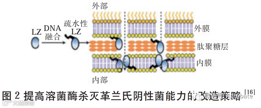 在溶菌酶蛋白质结构中加入 1 个外露的疏水性结构域 [16],如图 2 所示,该结构可以与外膜发生融合,溶菌酶可插入质膜中进行杀菌 [17]。有研究显示,在溶菌酶羧基端可插入疏水性肽,改性后溶菌酶酶活性变化不大,但对 E.coli 的杀菌能力显著增强,可能是由于溶菌酶对 E.coli 外膜和肽聚糖作用的结果 [18-19]。