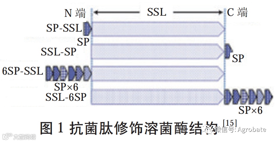 生物改性也是一种提升溶菌酶抑菌活性的方法,通过生物技术手段改变溶菌酶的结构,进而影响其功能及理化性质。比如可将抗菌肽或疏水基团引入溶菌酶分子结构中,增强自身疏水性,得以穿过脂多糖层进入 G-的肽聚糖层,提高对 G-的抑菌性能。Zhu 等 [16] 研究发现,将氨基酸序列为(A-W-V-A-W-K)的抗菌肽(SP)与猪溶菌酶(Sus scrofa lysozyme,SSL)的编码序列 N端或 C 端进行融合(图 1),结果显示,构建表达载体后发酵产物 SP-SSL 既能保留猪溶菌酶杀灭 G+ 的能力,又具备抗菌肽的抗 G-活性。通过 Qrt-PCR、FC 等技术手段发现 SP-SSL 可以使靶细胞 E.coli ATCC10798 的细胞壁结构发生破坏,靶细胞透性增强,从而使细胞内容物流出,导致细胞死亡。