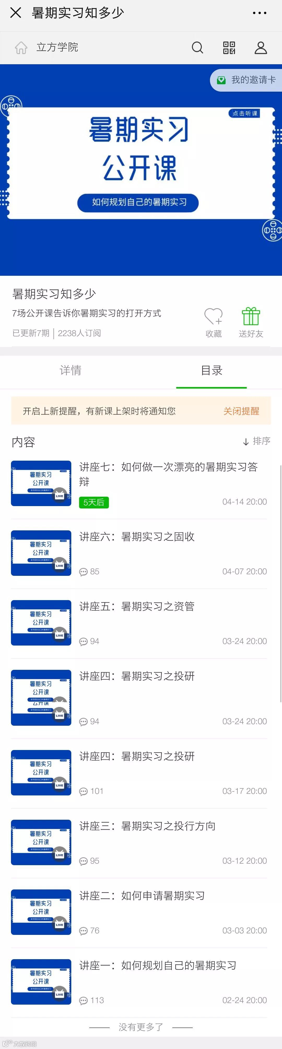 新进来的小伙伴,会自动获得观看前面各期讲座的权限。只需要在“金融小伙伴”公众号菜单栏点击“更多干货”-“课程店铺”,下滑到【暑期实习知多少】即可观看。