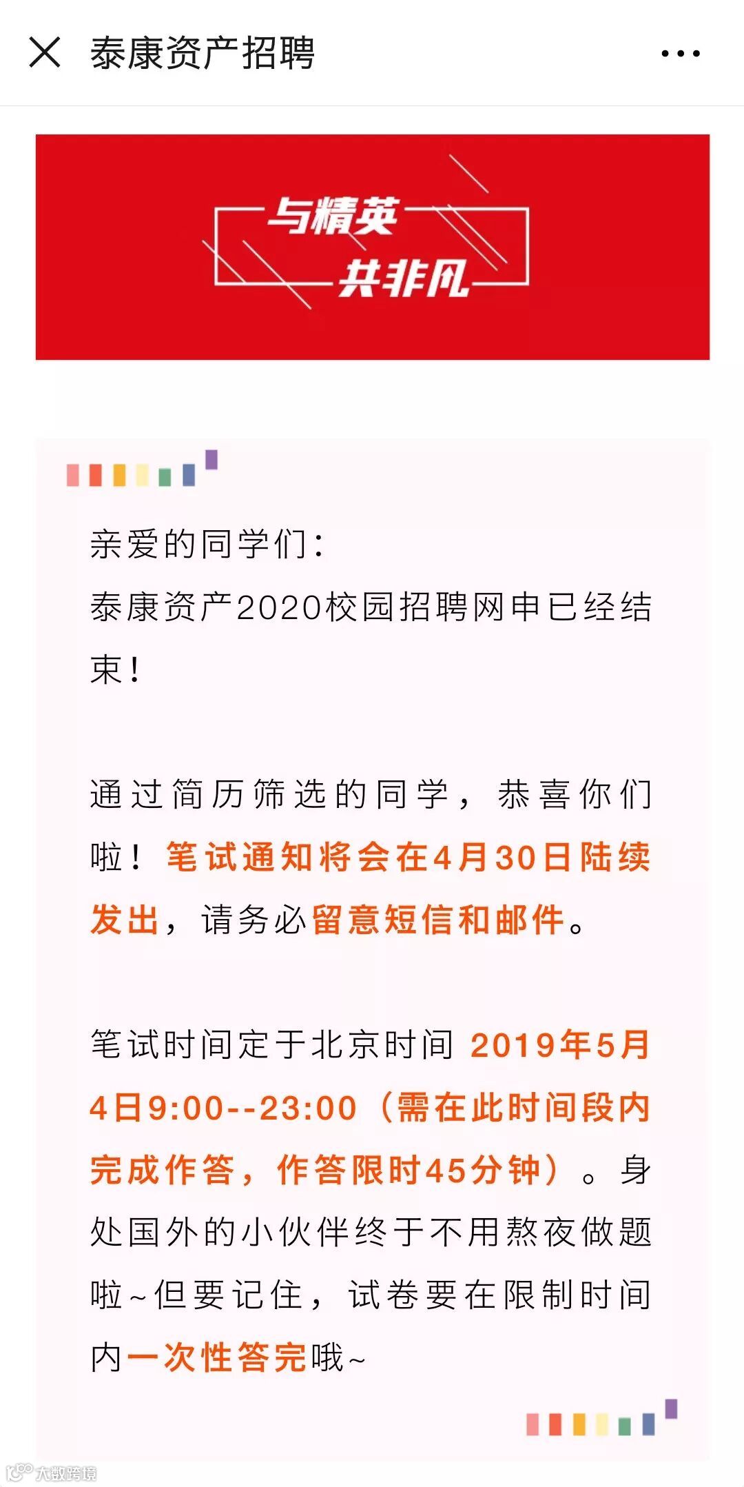 一是他们刚刚结束了网申,并开始发出笔试邀请;二是这个已经结束网申的招聘项目,不是暑期实习,而是2020校招!