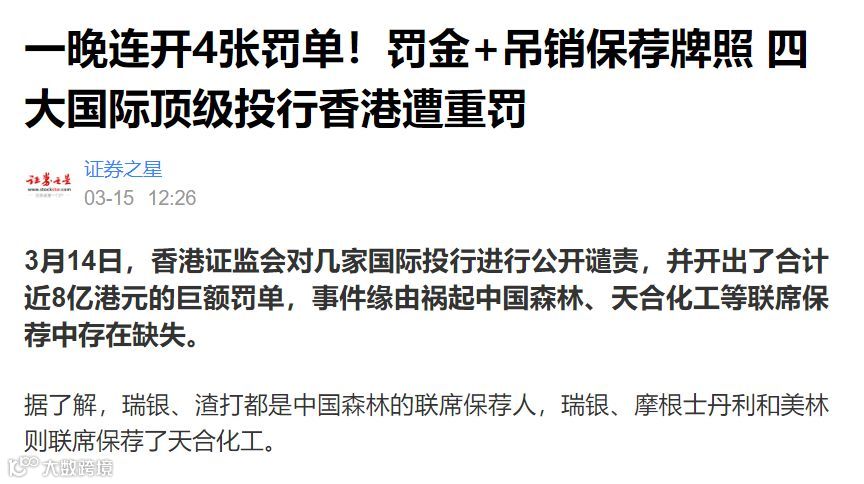 前不久,香港证监会一口气开出多张罚单,停牌多年的天合化工和中国森林的几家联合保荐人全部遭受重罚。其中,美林美银被罚款1.28亿港元、摩根斯坦利被罚款2.24亿港元,渣打证券被罚五千多万港元,瑞银被罚款3.75亿港元。
