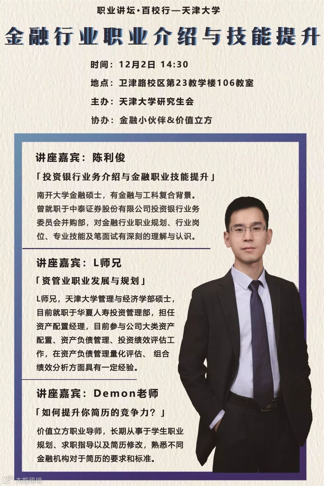 金融小伙伴【百校行】之天津大学专场将在12月2日举行,主题是“金融行业职业介绍与技能提升”。欢迎有志于金融行业的同学参加。