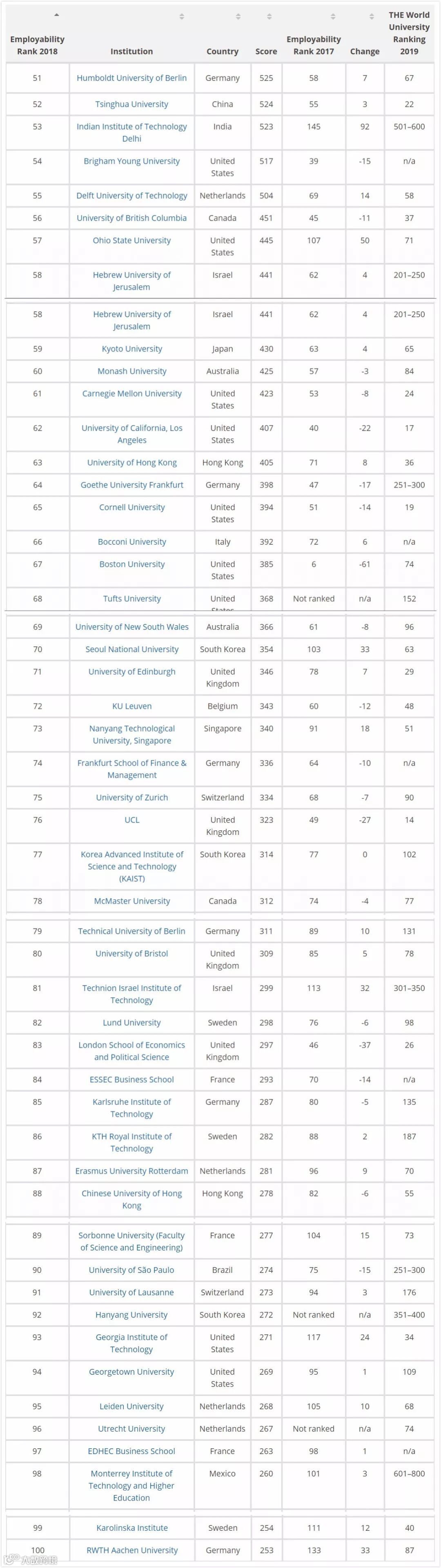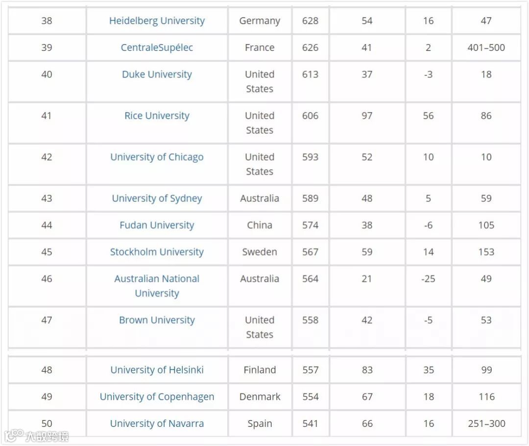 世界大学就业能力排名TOP50