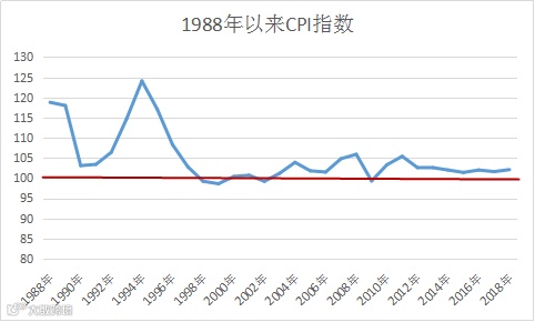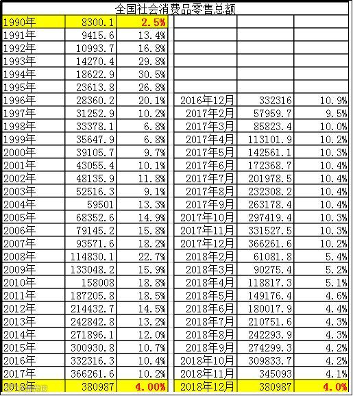请大家务必相信,绝对不要用去年的366261亿直接加减乘除,得出一个不扣除价格因素也只有4.0%的增幅,这样很容易让人发现,2018年的消费水平成为近30年来仅次于1990年的最低水平。