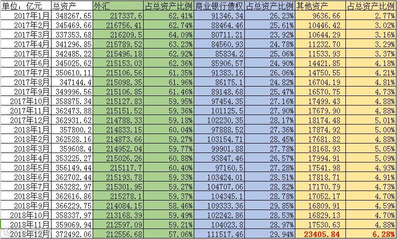 以下为近两年来央行资产表整理所得,从表中外汇占比看出,2018年反反复复试图拉升,却显得极其乏力,于是在12月,干脆直接放弃挣扎,当月新增资产13422亿元,几乎相当于2017年全年的增加值,商业银行债权(存款性金融机构债权)和其他资产各自贡献一半。