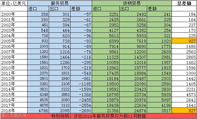 如果再加上服务贸易,由于2018年12月的服务贸易值尚未公布,此处虽然仅仅引用前11个月的数据,居然不影响结果,因为全年外贸总差额为827亿美元顺差,按照这个数字,不及2005年的927亿美元,相当于直接被打回2004年左右的水平
