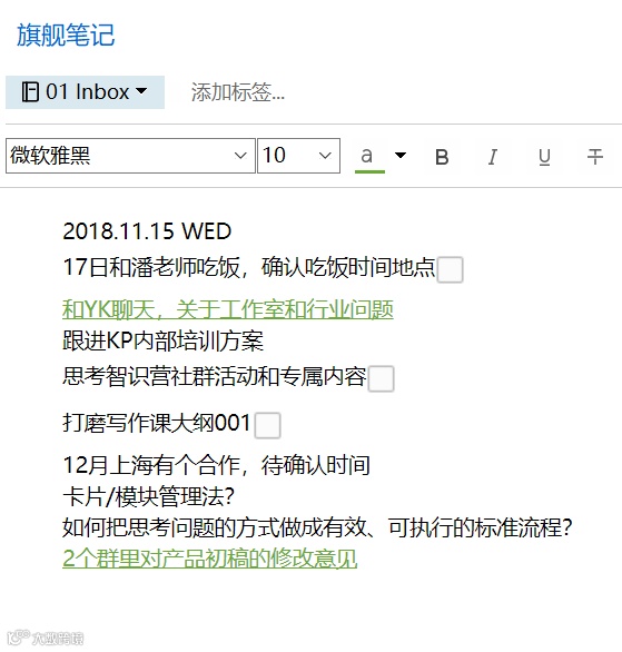 3)每天定期抽出一点时间,对当天的笔记进行处理:待办的,不作改动;正在处理的,在后面加个复选框;已经处理完毕的,在复选框里打个勾。