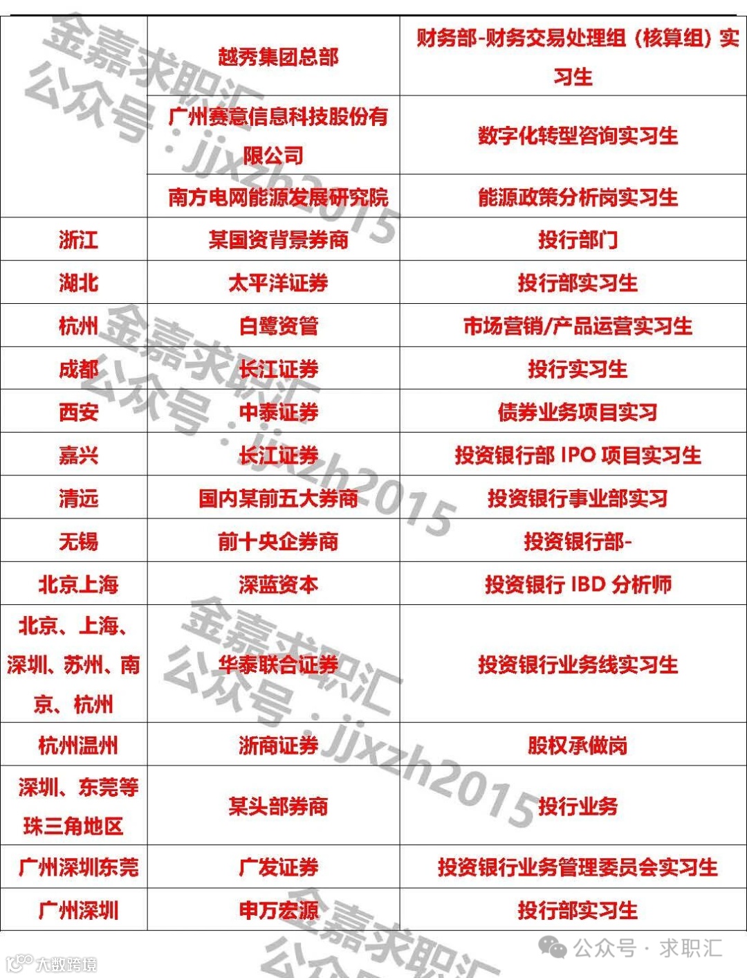 5、招聘要求:(1)研一、研二在读,或大四毕业即将读研;(2)财会类、金融类法律类、理工科类专业背景和复合专业背景优先;(3)抗压性强、适应长期出差、执行力强、热爱投行工作、有责任心、沟通能力强;(4)杭州高校学生或在杭州有住所为佳