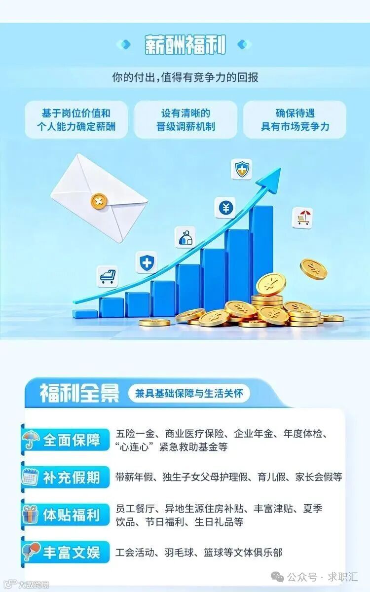五险一金,提供食堂、宿舍、班车、补贴、慰问等,福利体系较为完善。