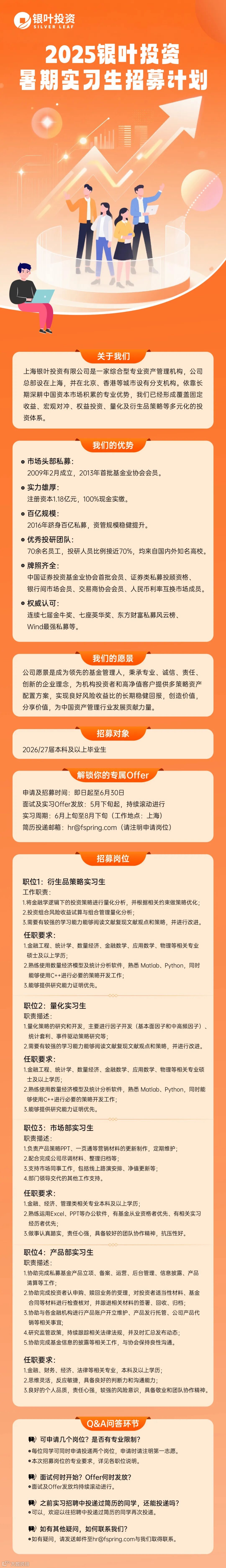 上海银叶投资有限公司成立于2009年2月,是一家综合型专业资产管理机构。公司是中国证券投资基金业协会(AMAC)普通会员、中国银行间市场交易商协会会员、人民币利率互换市场和远期利率市场成员。依靠长期深耕中国资本市场积累的专业优势,银叶投资已经形成覆盖固定收益、宏观对冲、权益投资、量化及衍生品策略等多元化的投资体系。公司愿景是成为顶尖的基金管理人,秉承专业、诚信、责任、创新的企业理念,为机构投资者和高净值客户提供多策略资产配置方案,实现良好风险收益比的长期稳健回报,创造价值,分享价值,为中国资产管理行业发展贡献力量。