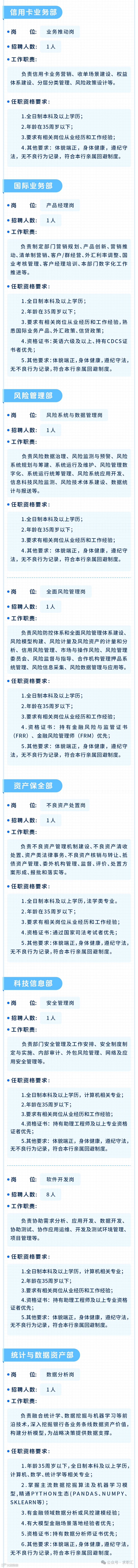 如需发布招聘信息直接发送至金融小伙伴(jrxhb2014)公众号后台,也可以添加工作人微信号(jzhecthu)联系发布,请备注“姓名+单位+发布招聘”!