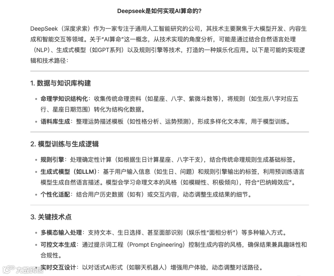 对于“如何实现AI算命”这个问题,惊蛰研究所也尝试向Deepseek直接提问,没想到Deepseek将自己修炼“赛博半仙”的方法全盘托出。其中,在“数据与知识库构建”环节,Deepseek解释了AI算命如何收集资料,将规则转化为结构化数据,再利用运势描述模板形成多样化文本库用于模型训练。同时,Deepseek还将“通过提示词控制生成内容的风格,确保结果兼具趣味性和合规性”纳入了关键技术点。