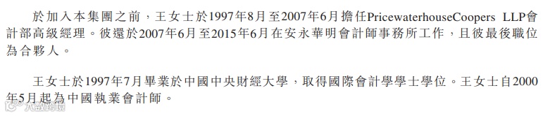 她毕业于中央财经大学,取得国际会计学学士学位,曾在普华永道LLP会计部担任高级经理,后又在安永华明会计师事务所工作,最后职位为合伙人。