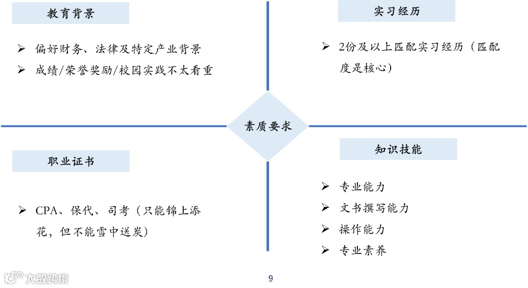 当然,专业素养也很重要,比如路演、演讲、表达能力。除此之外,如果你有CPA、保代和司考证书,那么可以锦上添花。