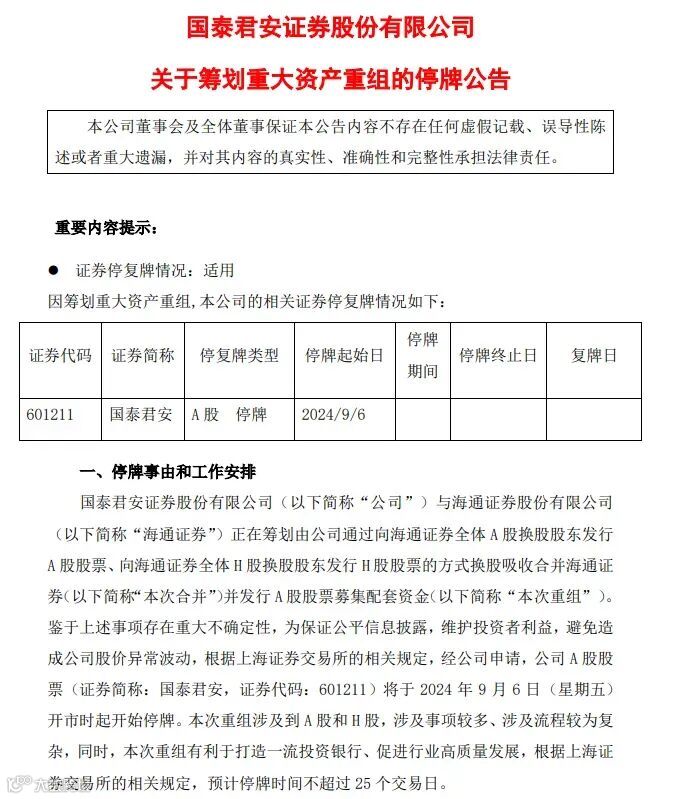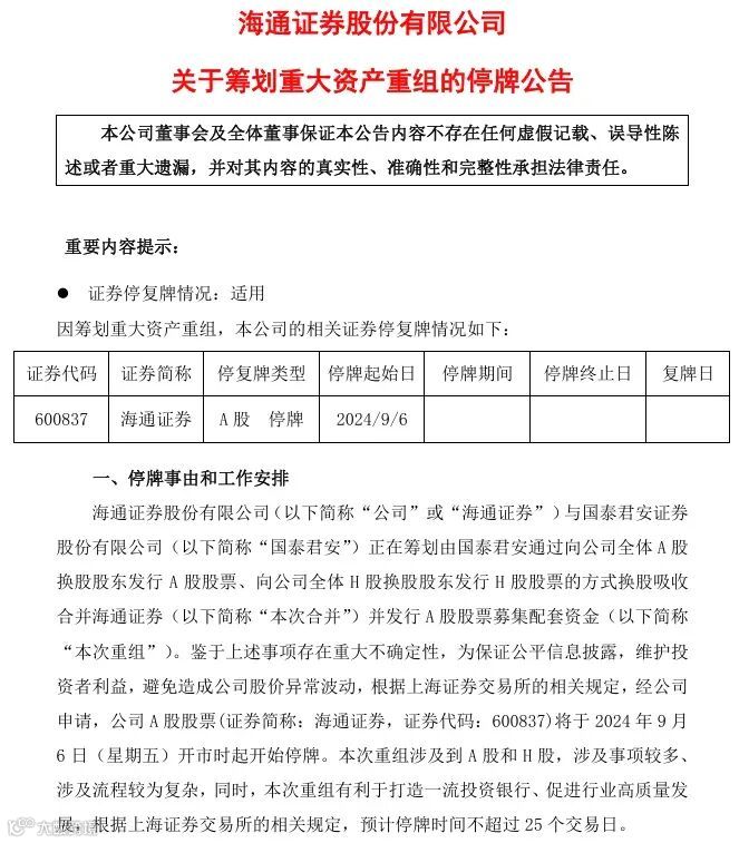 9月5日深夜,国泰君安、海通证券双双公告称,国泰君安与海通证券正在筹划由国泰君安吸收合并海通证券并发行股票募集配套资金。两家公司将于9月6日(星期五)开市起开始停牌。