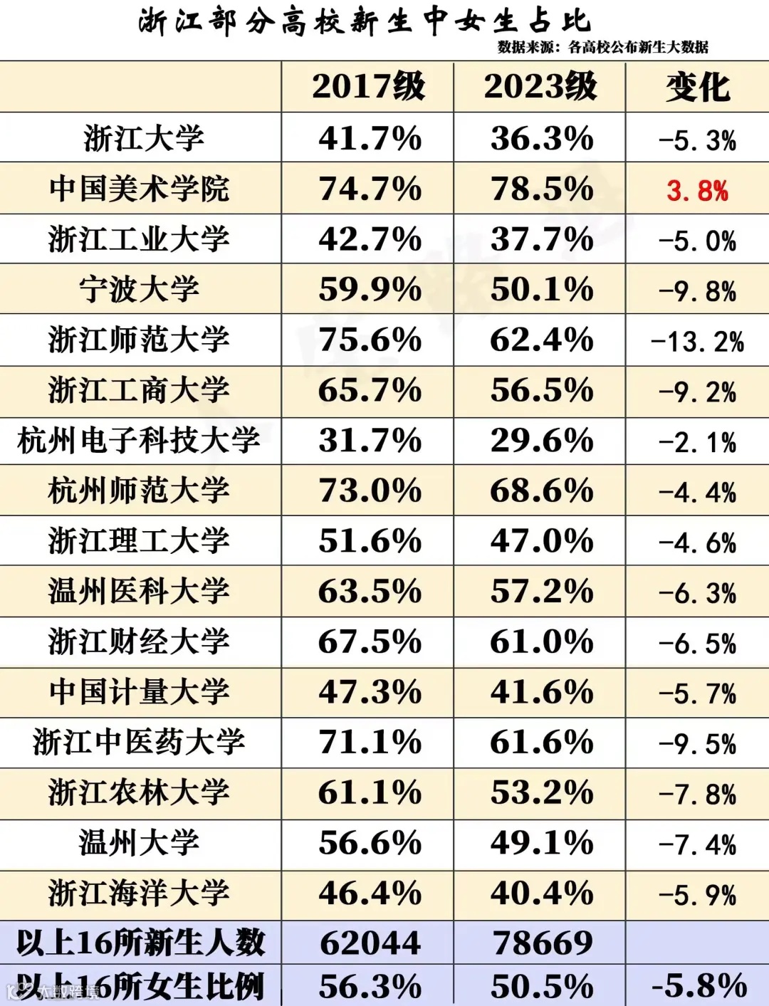 以浙江为例,虽然总体女本科生的数量在增加,但几乎所有头部高校女生比例都在下降。