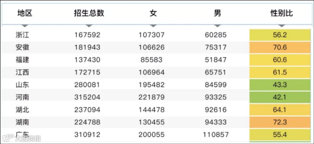 山东19.5万女本科生,8.4万男本科生。女生是男生的2.3倍。