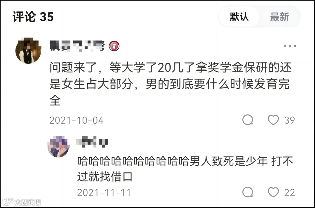 但实际上很多男孩子也会被这么劝说。而且2010年以前,中高考内卷没那么严重,男大学生的人数更多,总不能说那时候的安安静静与现在的不一样吧。