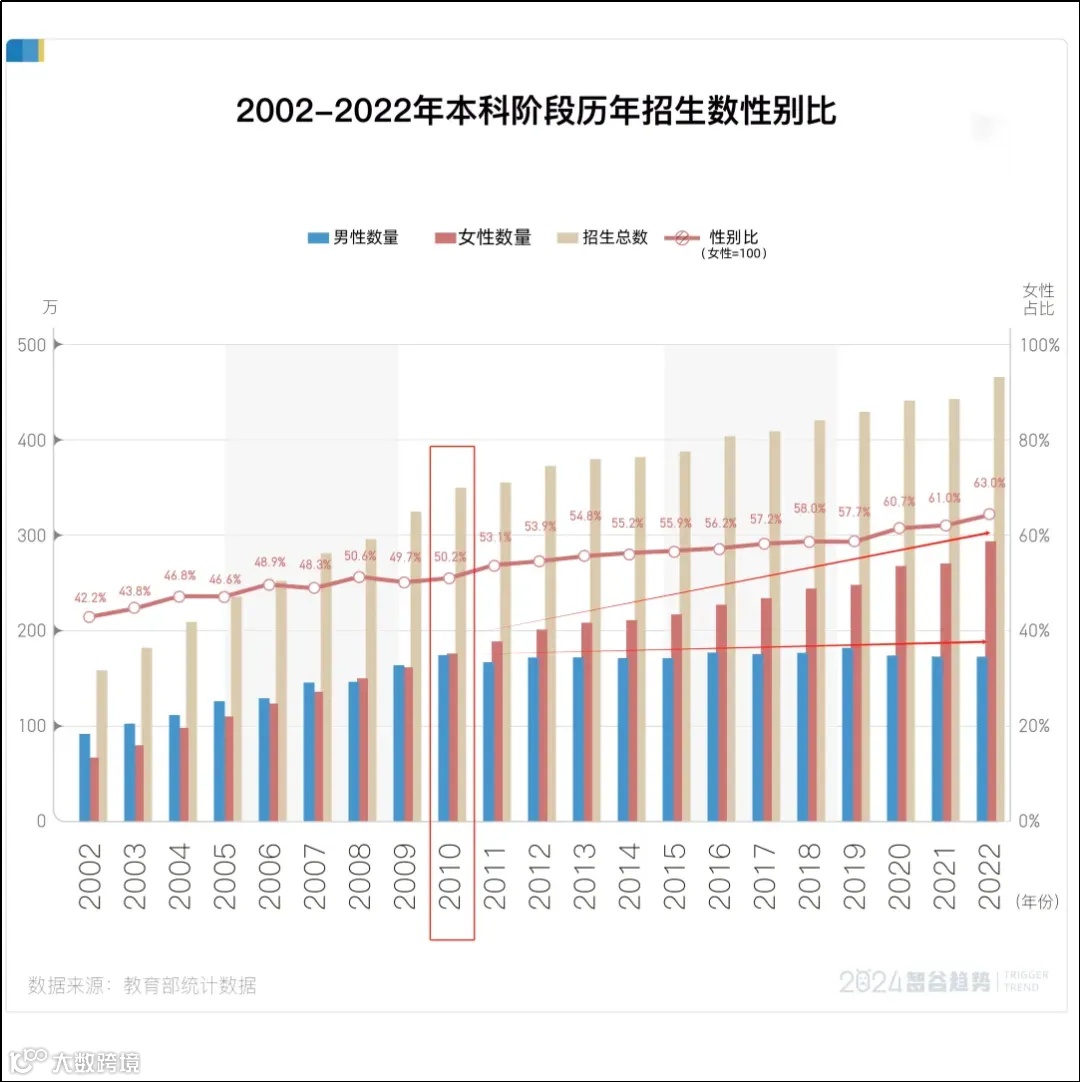 2010年,本科招339万人,女性占到了一半,并开始反超。