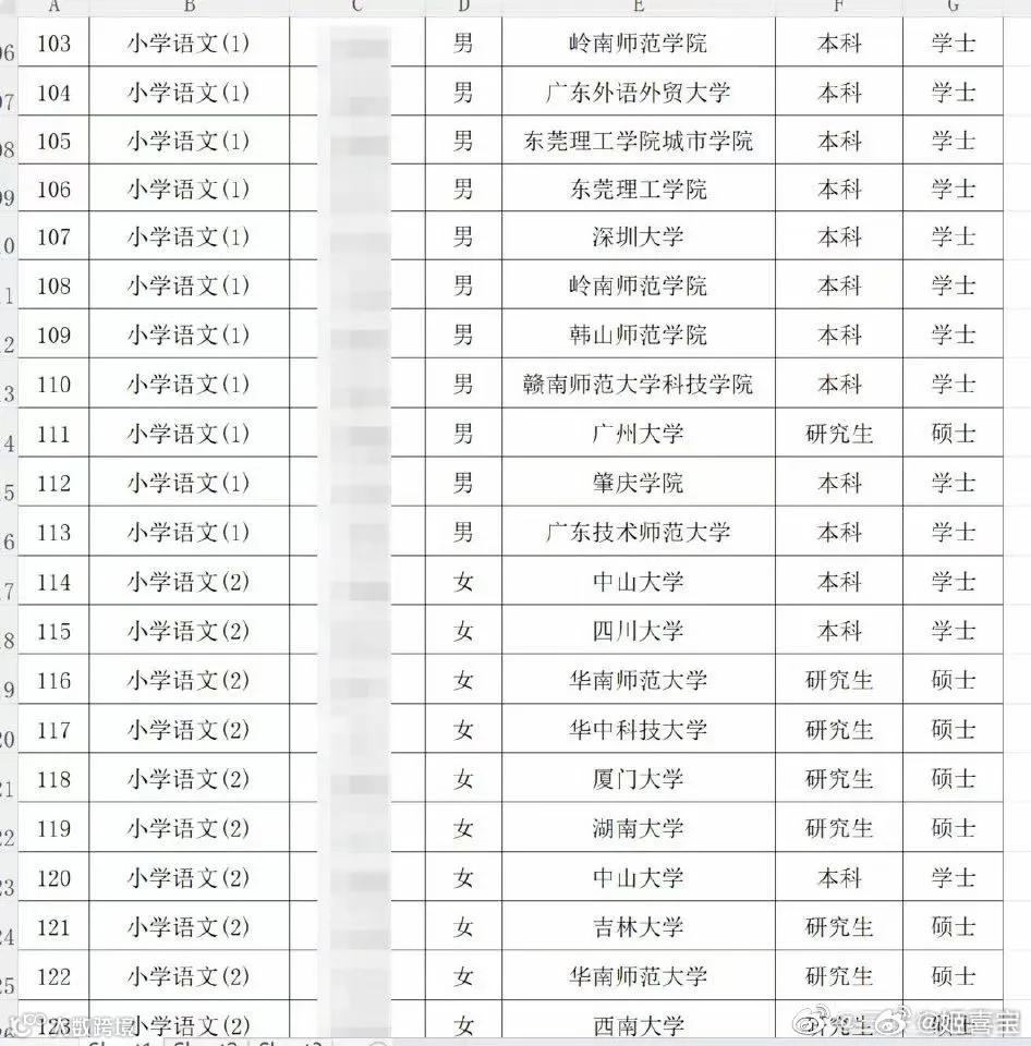 女教师几乎全是名校且普遍是硕士,男教师几乎全是普通三本本科生。