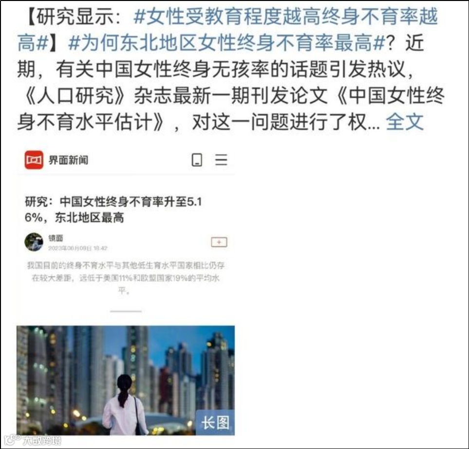 “高受教育程度以及居住在城市、东北地区、极低生育水平省份的女性,终身不育率更高。”