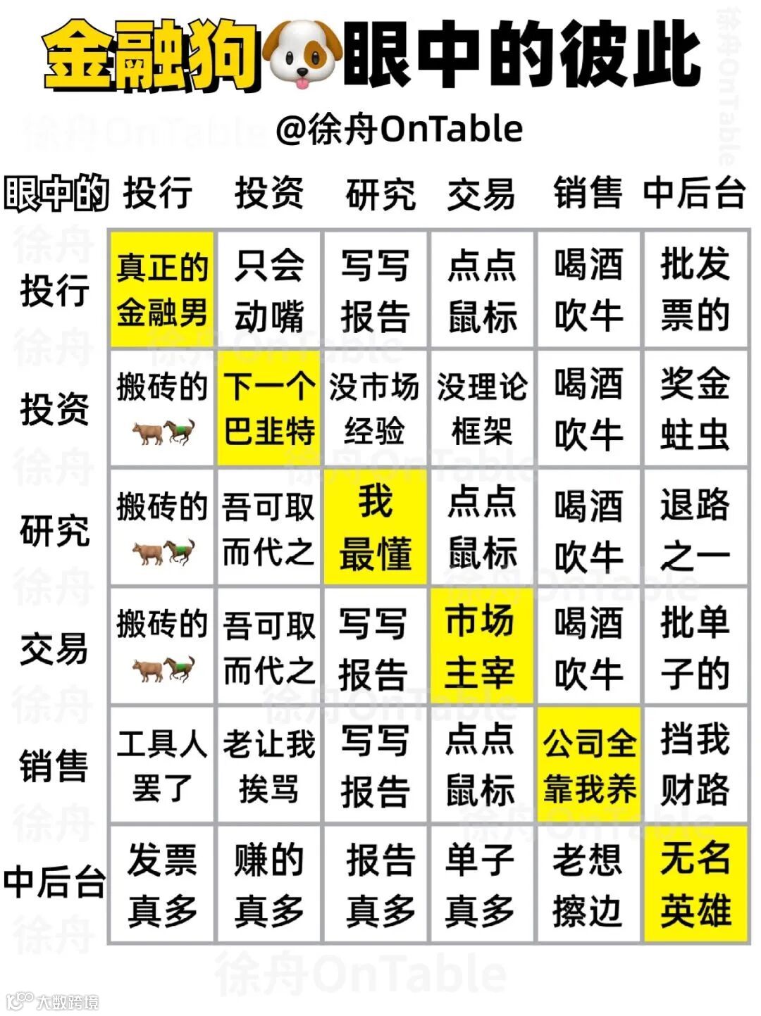 不知道你们看没看过一张图,写的是金融人眼中的彼此,每个岗位都觉得自己在行业内才是专业的,殊不知在别的岗位眼中有各种各样的情况。
