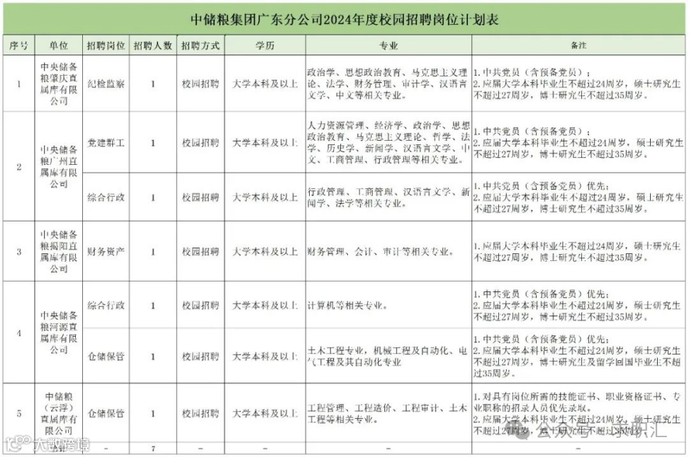 本次招聘为中储粮集团广东分公司辖区直属企业岗位,计划校园招聘7人,包括党建群工、纪检监察、综合行政、财务资产、仓储保管等岗位。面向按时毕业并取得相应学历学位的普通高等学校2024年应届毕业生以及2023年7月至2024年7月期间取得国(境)外学历学位的留学归国人员。