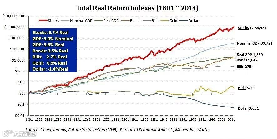 有人统计过,从1801年到2014年美国各项理财产品的投资收益率,结果发现,黄金的平均年化收益率只有可怜的0.5%,远远不及短期债券(2.7%)、长期债券(3.5%)和股票(6.7%)。