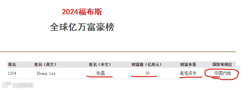 从2005年的2000万美元启动资金,到2021年高峰时,高瓴管理的资金规模高达1000亿美元(约6500亿元)。张磊本人也凭借优异的成绩,常年入选富豪榜。根据《2024福布斯全球富豪榜》,张磊今年身家30亿美元(约210亿元),排全球1104名。值得注意的是,张磊在榜上的国家显示是“中国内地”。