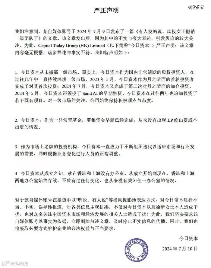 7月,投资人徐新亲自下场辟谣。此前,关于“今日资本裁撤一级团队,转做二级基金”的消息在业内广为流传。声明中写道:今日资本在过往几年中一直持续深耕一级市场,对一级市场始终保持积极观点与态度。