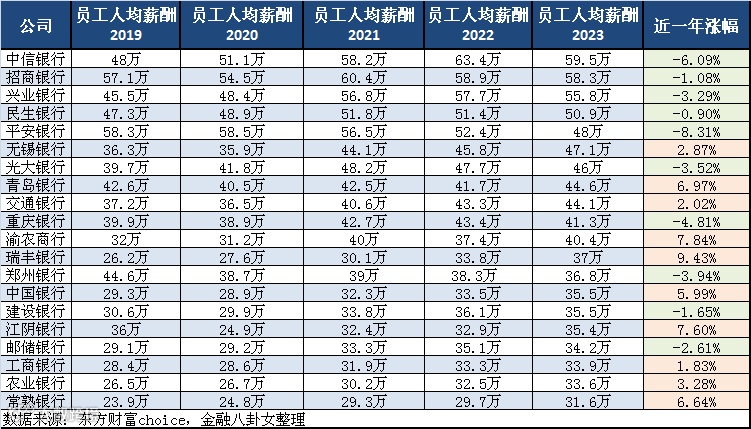 今年金融圈开始了降薪,尤其是银行。一眼看上去,好像降幅不大,是人均年薪48万以上的,都有小幅下降,而人均年薪低于40万的,大多数还有小幅上涨: