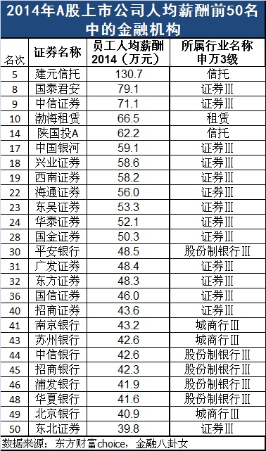 要知道,十年前,也就是2014年,A股上市公司人均薪酬的前50名里,有26家都是金融机构,其中5家是股份制银行,13家券商。当时金融里的第一名,正是圈内号称“最令人羡慕的offer”的安信信托(现在改名叫建元信托),人均薪酬可以达到130.7万。
