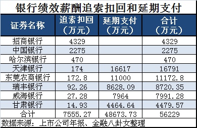 有8家上市银行公布了绩效薪酬追索扣回情况,分别是中国银行、招商银行、哈尔滨银行、天津银行、东莞农商银行、瑞丰银行、威海银行、甘肃银行: