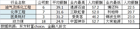 此外,化工和新材料等专业对口的行业,如油气及炼化工程、化学工程、医美耗材和动力煤(煤化工)等,行业平均薪酬都超过了24万,而且业内人均薪酬最高的公司能超过50万。