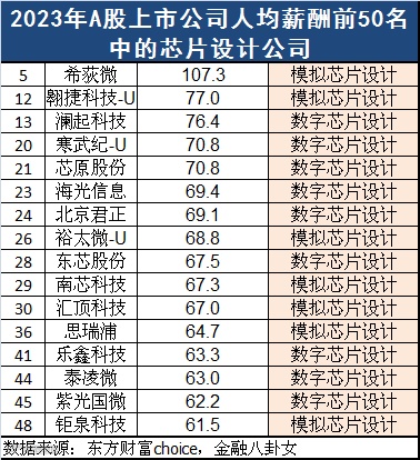 最大的一个亮点,是人均薪酬前五十名的上市公司里,“芯片设计”类的公司已经追赶超越了以前最赚钱的金融。