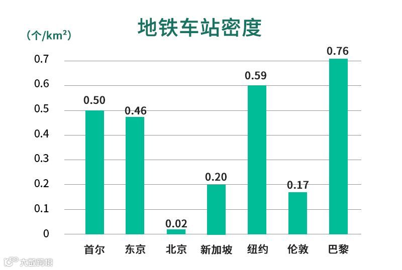 澎湃新闻2018年2月发布的数据显示,北京的地铁车站密度仅为0.02,密度最高的欧洲城市巴黎是北京的38倍,密度最高的亚洲城市首尔是北京的25倍。