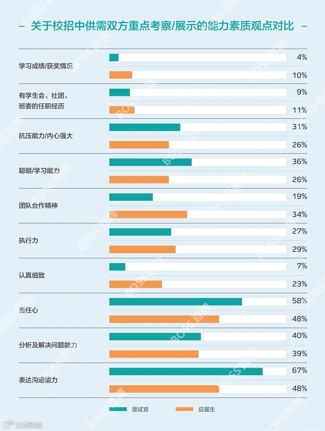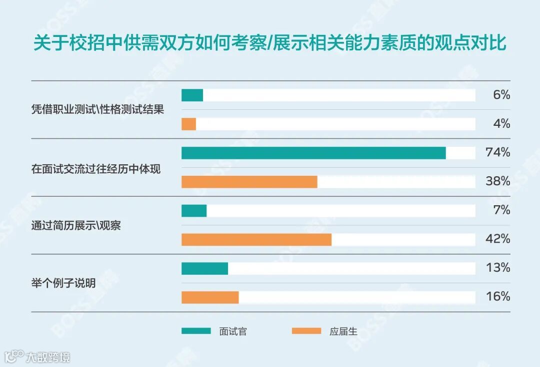 但学习能力的考察并不来源于应届生的学习成绩,74%的面试官会通过毕业生的过往经历去观察、追问对方是否具备自己在意的能力。