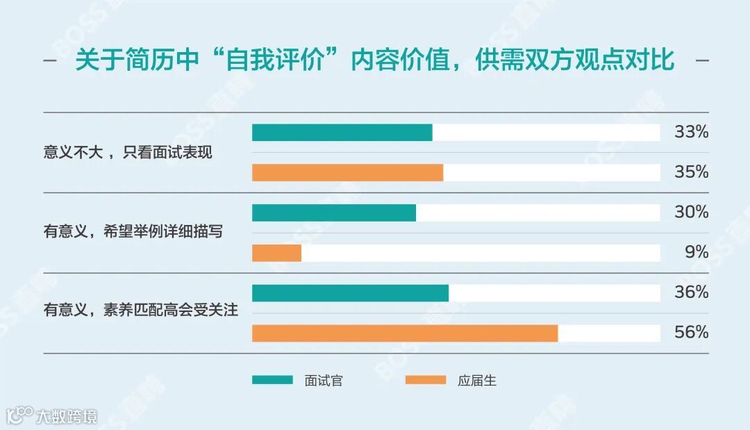 在调查中,我们观察到,大部分面试官与应届生都认可简历中“自我评价”阐述的价值。超过三成的面试官们更希望应届生能够在简历中举例说明,详细描述自己的优势。