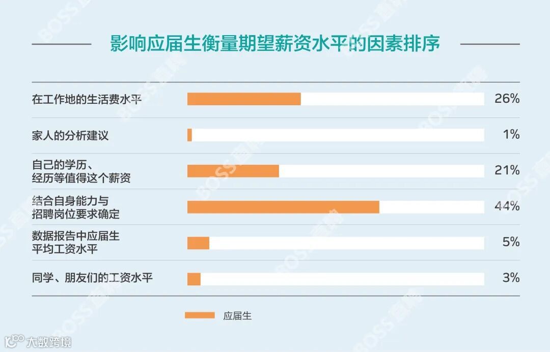 从调研来看,44%的应届生表示会结合自身能力与岗位要求来确定自己的期望薪资,工作地的生活费水平是影响应届生确定期望薪资标准的重要影响因素。